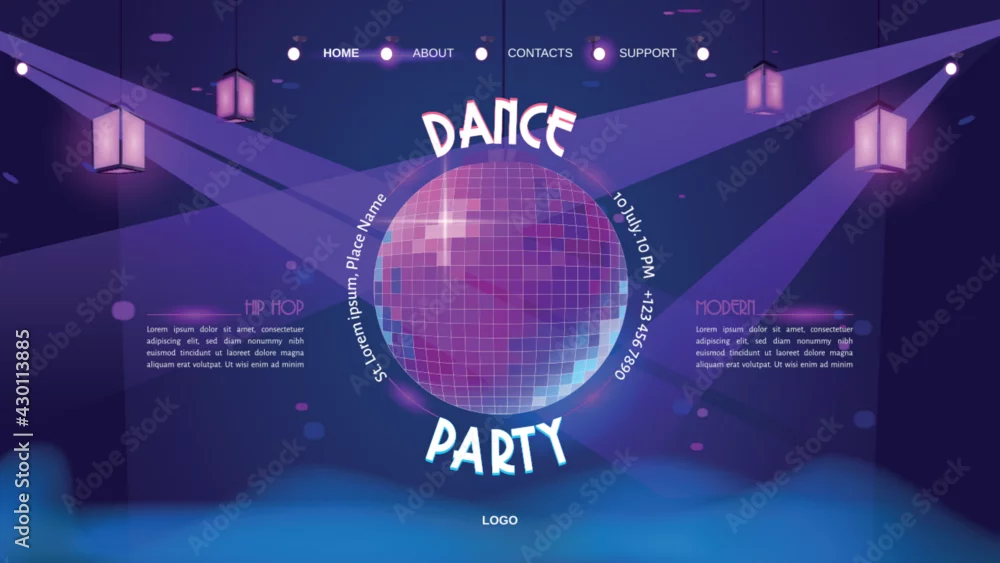 Obraz Dance party cartoon landing page with glowing disco ball on purple neon glowing background. Invitation to night club event, recreational music show with hip hop modern compositions, Vector web banner