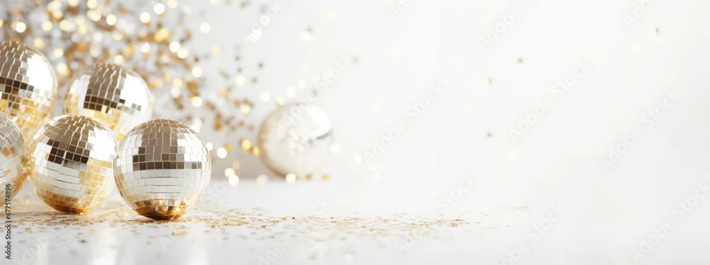 Glam New Years Eve or birthday party celebration background with golden balloons, disco balls, confetti. Festive wide web banner with disco balls, copy space