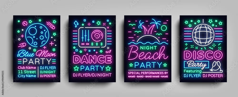 Obraz Klubowa kolekcja plakatów. Nocna impreza, neon, ulotka z neonem, dyskoteka, plakat muzyczny noc, jasne neonowe reklamy, koncert, dyskoteka, festiwal. Ilustracje wektorowe - do dyskoteki - Picturewall.pl