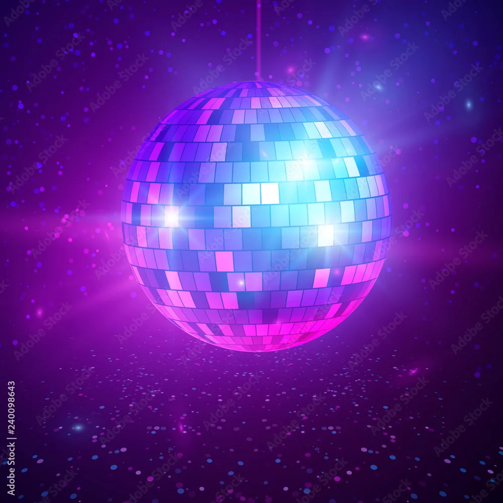 Obraz Kula dyskotekowa lub lustrzana z jasnymi promieniami. Muzyka i taniec noc party tło. Klub nocny streszczenie tło retro z lat 80. i 90. Ilustracji wektorowych