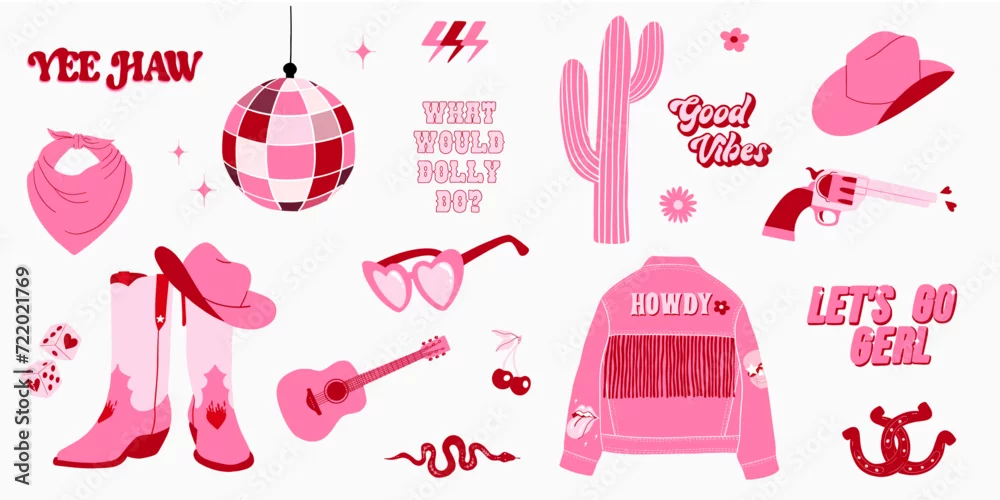 Trendy pink cowgirl set. Retro collection of cowboy boots and hat, disco ball, horseshoe, cactus, gun, jacket and lettering. Wild west, western themed. Hand drawn vector design