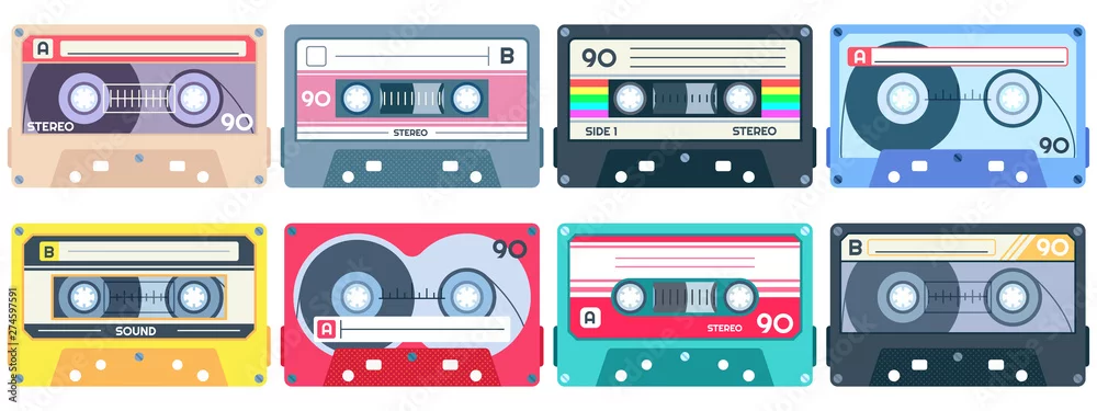 Vintage tape cassette. Retro mixtape, 1980s pop songs tapes and stereo music cassettes. 90s hifi disco dance audiocassette, analogue player record cassette. Isolated symbols vector set