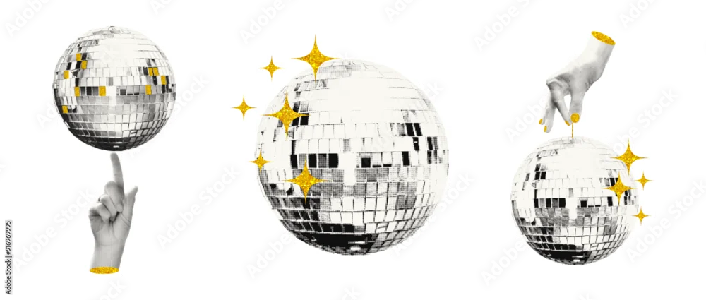 Shiny disco balls and cut out hands halftone collage vector illustration. Set of trendy modern retro elements with gold glitter star decoration isolated on transparent background