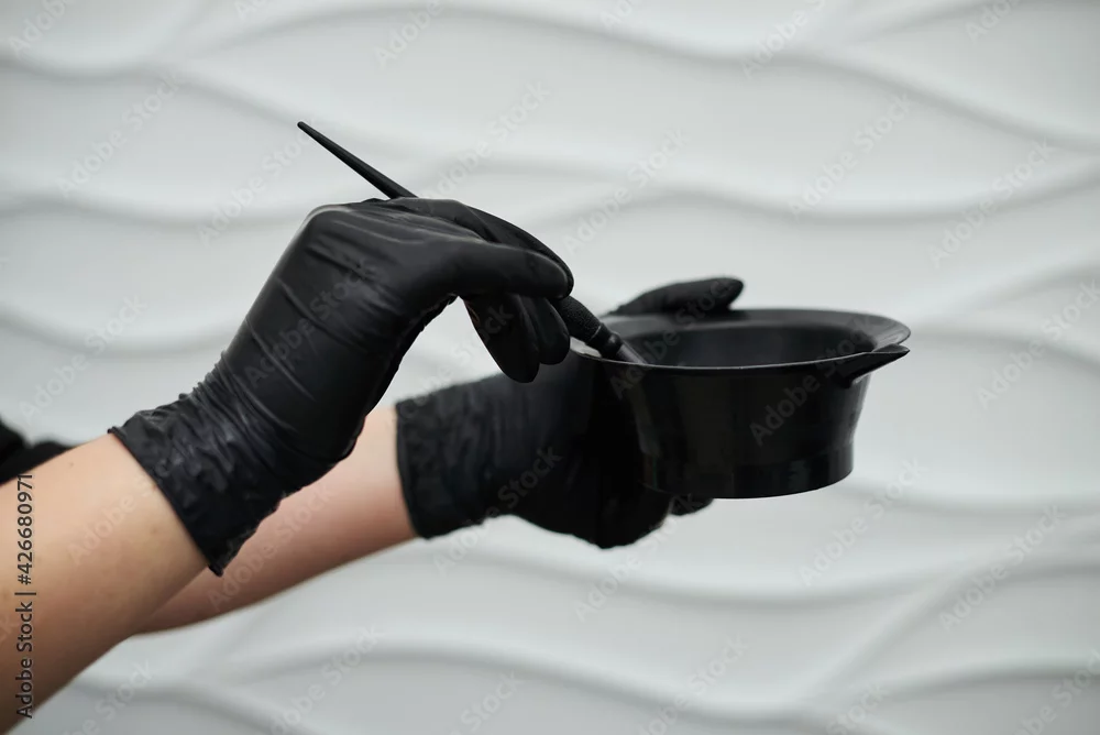 Obraz Close-up picture of hairdresser's tools in female hands with black gloves. Process of mixing hair dye with brush in plastic bowl. Hair stylist preparing for dying hair in barber shop. Beautification. - do fryzjera - Picturewall.pl