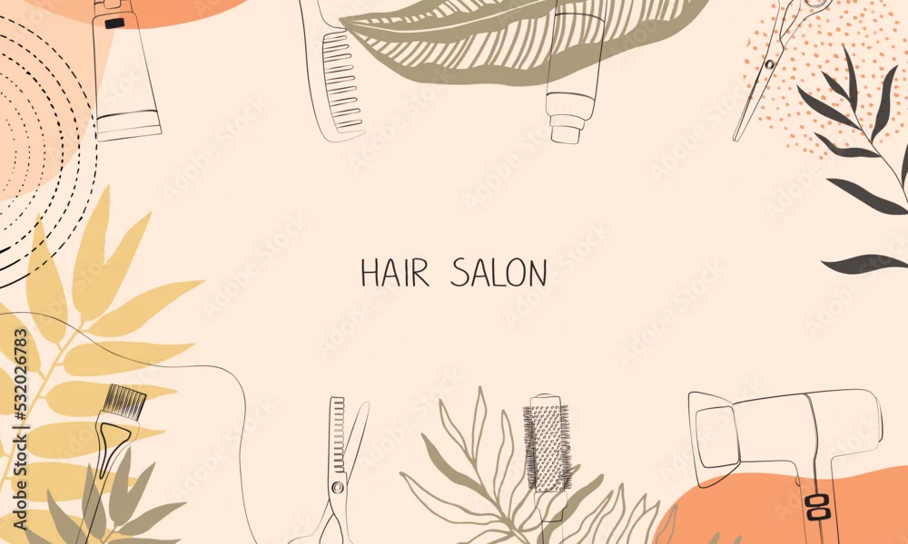 Frame, border of hairdressing tools. Hair salon accessories outline, comb, scissors and abstraction. Vector illustration, template for design and hairdresser information.