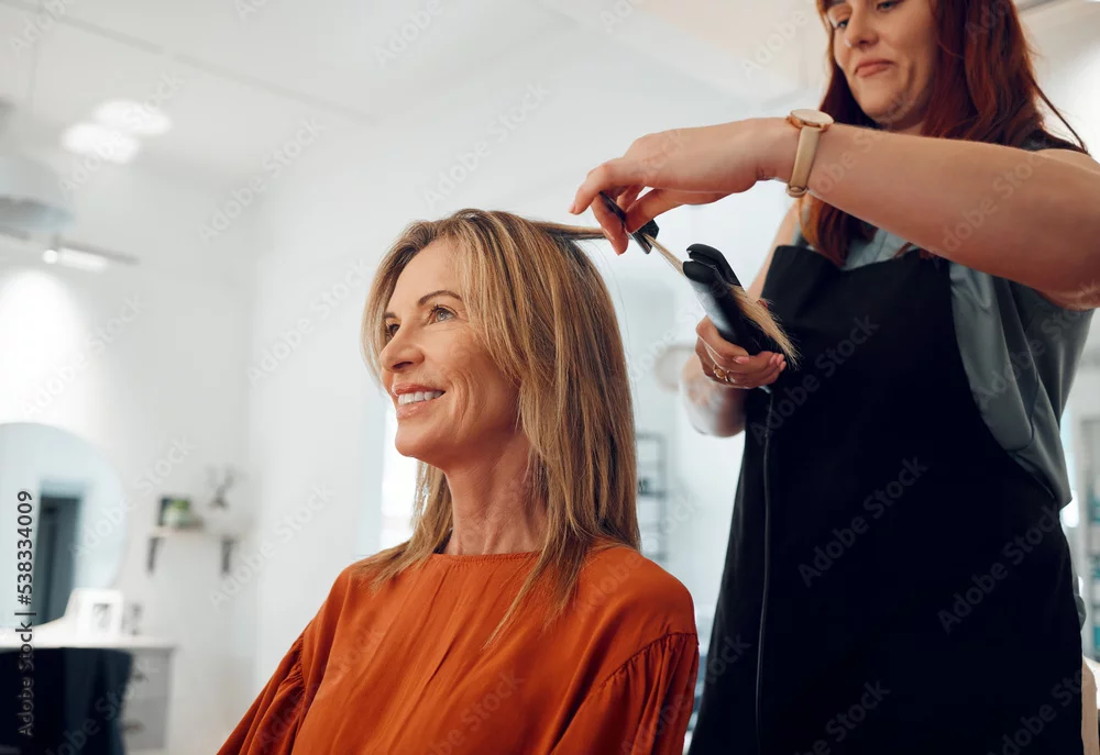 Salon, haircut and style with a woman customer straightening her hair for beauty or wellness. Fashion, client and hair with a female hairdresser or beautician at work with a consumer for haircare