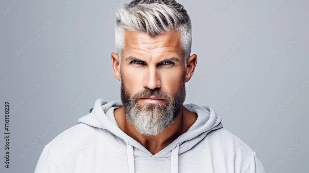 Obraz Well groomed bearded man over 45 years old. Beard style for men. Concept for men's mustache and beard hair care. Senior age model men - do fryzjera - Picturewall.pl