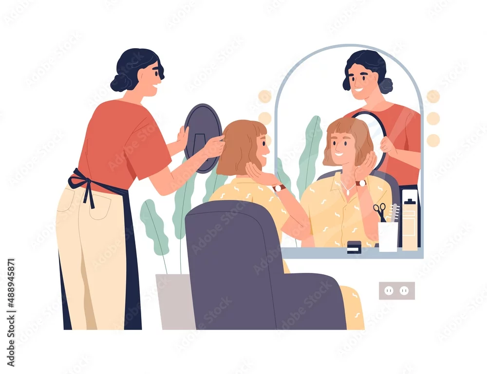 Woman client with bob haircut looking in mirror in salon. Happy satisfied customer in chair and hairdresser after hair cutting. Makeover concept. Flat vector illustration isolated on white background