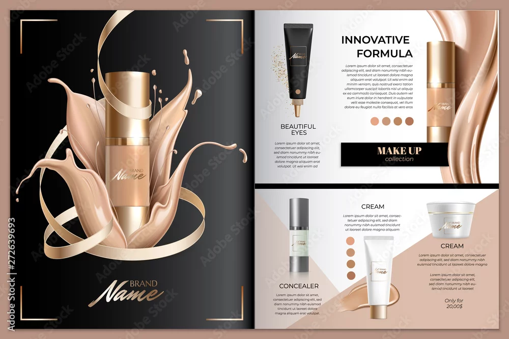 Advertising poster for cosmetic product for catalog, magazine. Design of cosmetic package. Advertising of foundation cream, concealer, base, BB cream. Realistic creamy texture