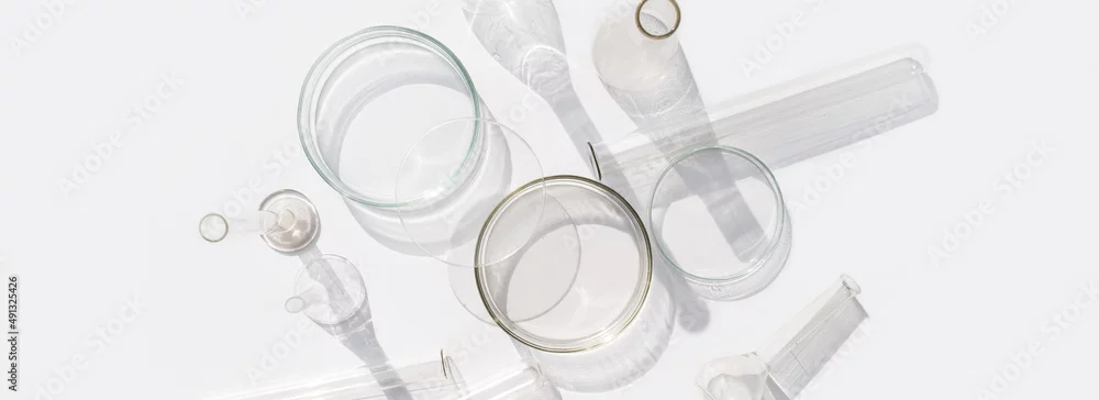 Banner Natural medicine, cosmetic research, bio science, organic skin care products. Top view, flat lay. Skincare. Scientific laboratory glassware. Research and development Concept.