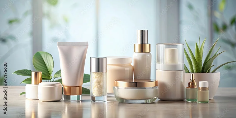 Obraz Cosmetic beauty products mockup on table with cream container - do gabinetu kosmetycznego - Picturewall.pl