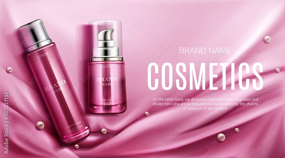 Cosmetics tubes mockup banner, natural beauty cosmetic product for face or body care on pink silk folded glossy textile background with pearls, bottles package design Realistic 3d vector illustration,