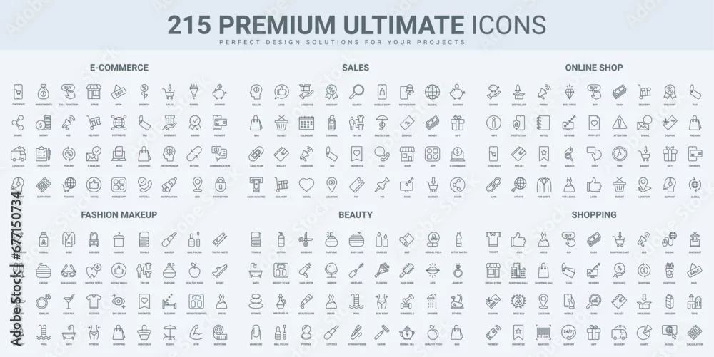 Obraz Ecommerce, retail shop sales, fashion makeup and body care thin black line icons set vector illustration. Outline symbols of purchases in mobile store app, payment and wallet, support collection