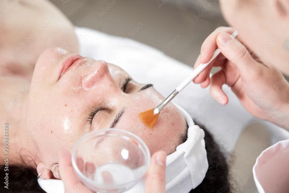 Facial peeling, skin treatment. A dermatologist applies of phytic acid with a white fan brush on female face. A caucasian woman in cosmetic clinic. Cosmetology, facial skin care. Girl in beauty salon