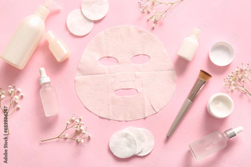 Obraz Facial sheet mask with different cosmetic products and gypsophila flowers on pink background