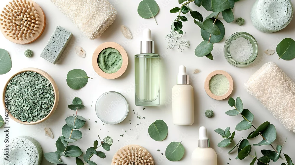 Obraz Flat lay composition with body care products and eucalyptus branches on white background