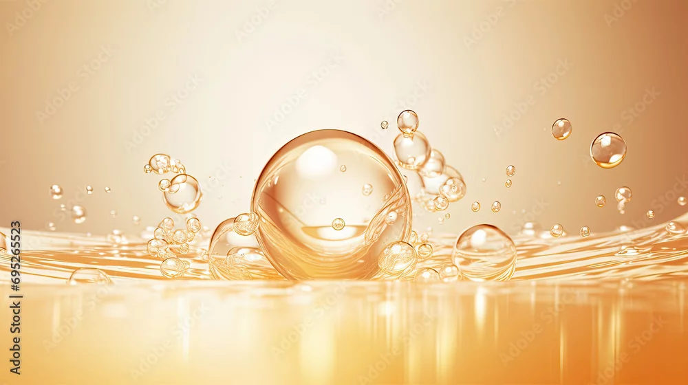 Obraz Golden yellow abstract oil bubbles or face serum background. Oil and water bubbles .golden yellow Bubbles oil or collagen serum for cosmetic product, - do gabinetu kosmetycznego - Picturewall.pl