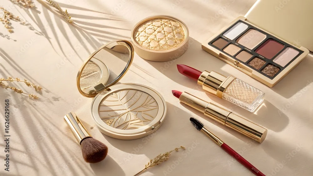 Obraz Luxurious makeup products arranged with soft lighting and natural elements