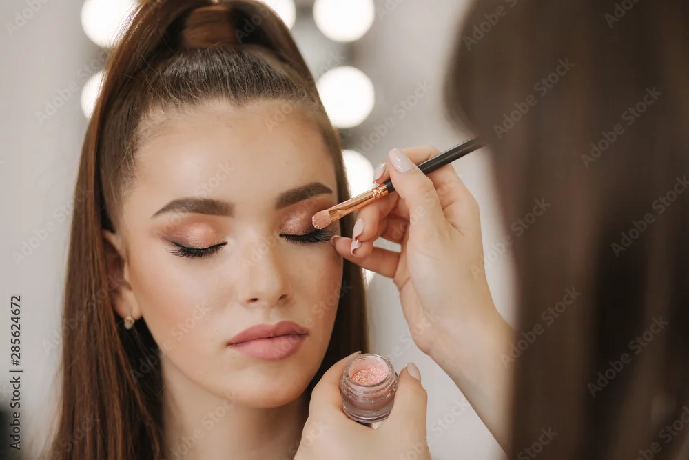 Obraz Makeup artist applies eye shadow, perfect evening makeup. Beauty redhead girl with perfect skin and freckles - do gabinetu kosmetycznego - Picturewall.pl