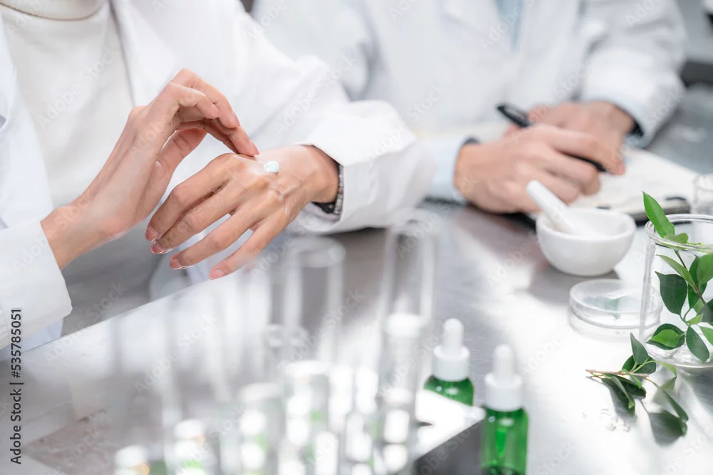 Obraz medicine biology laboratory of organic plant experiment test in glasses tube of cosmetic chemistry research medicals, chemical biotechnology science of nature leaf and green herbal oil technology