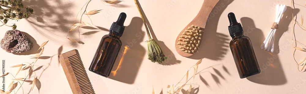 Natural cosmetics product background, banner. Serum or oil and cosmetic skin care, zero waste, eco friendly bathroom and spa accessories, volcanic aromatherapy stone and herbs. Earth tones decor