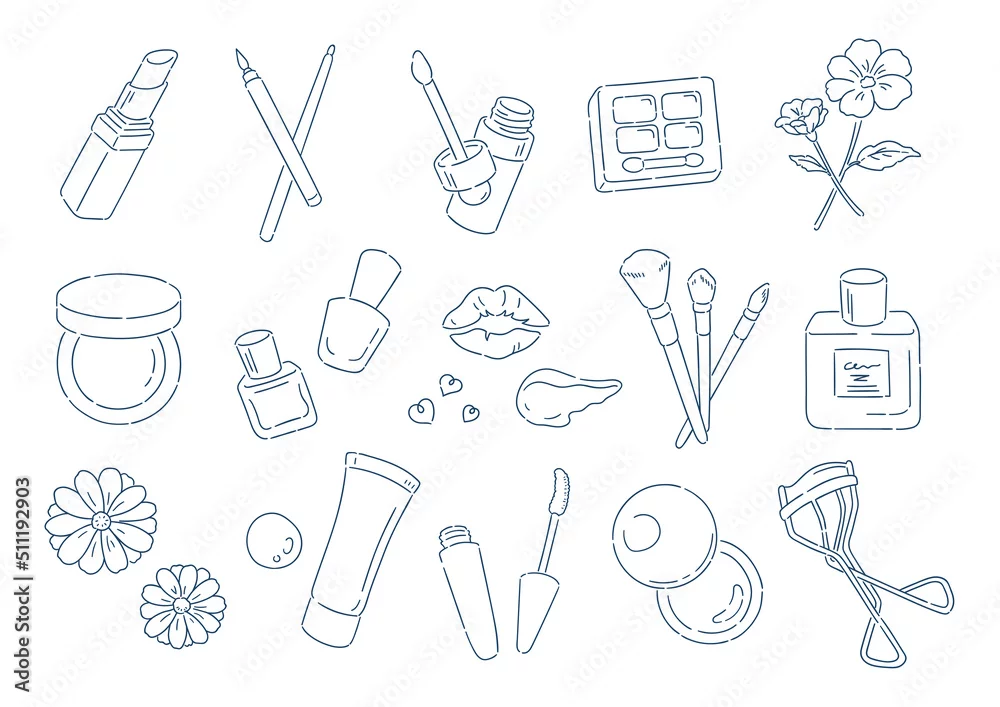 Obraz 化粧道具一式のイラスト素材. 美容, メイクアップをテーマにした挿絵セット. シンプルな線画.