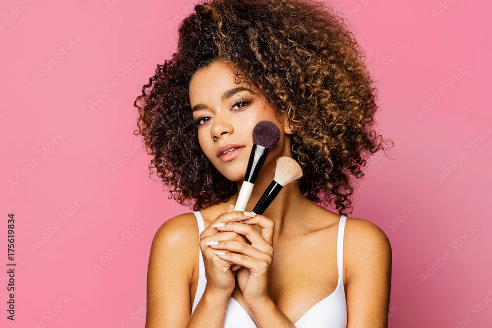 Obraz Portrait of the beautiful black woman with make-up brushes near attractive face
