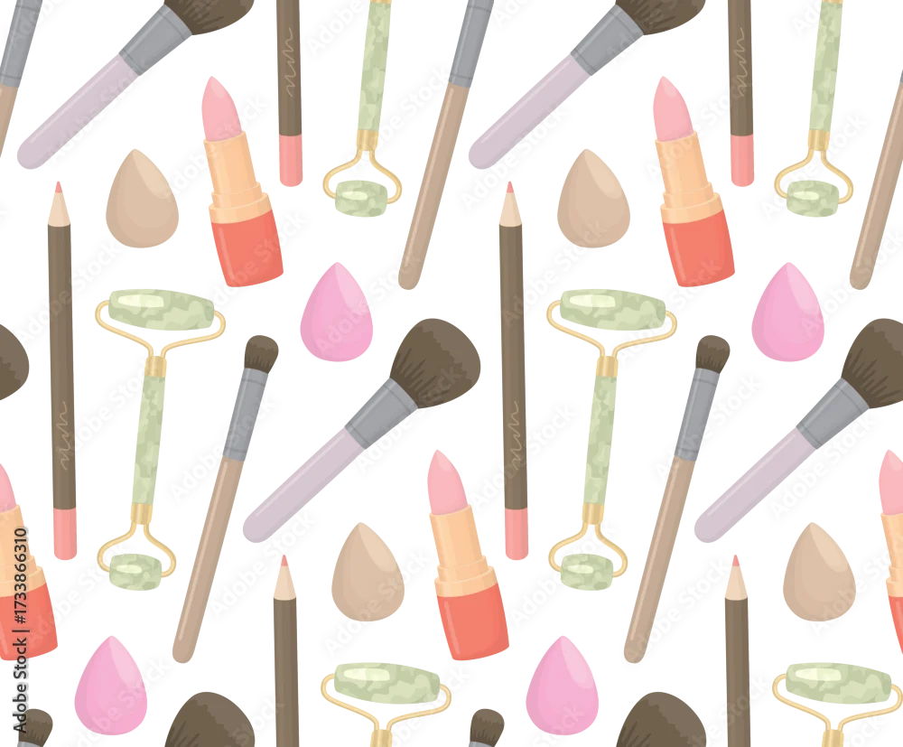 Obraz Seamless pattern with facial rollers, lip pencils, makeup brushes, lipsticks and beauty sponges. Background with beauty routine elements - do gabinetu kosmetycznego - Picturewall.pl