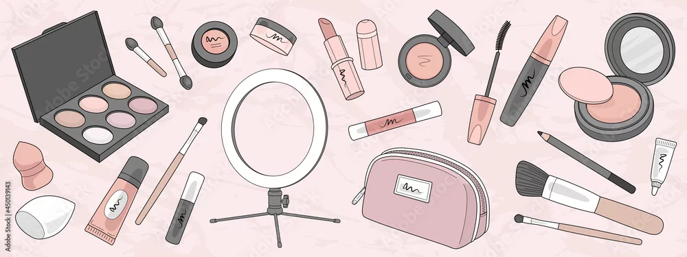 Set of make up products and brushes isolated on background. Hand drawn cosmetics set. Mascara, lipstick, eye shadows, brush, powder, lip gloss. Vector illustration