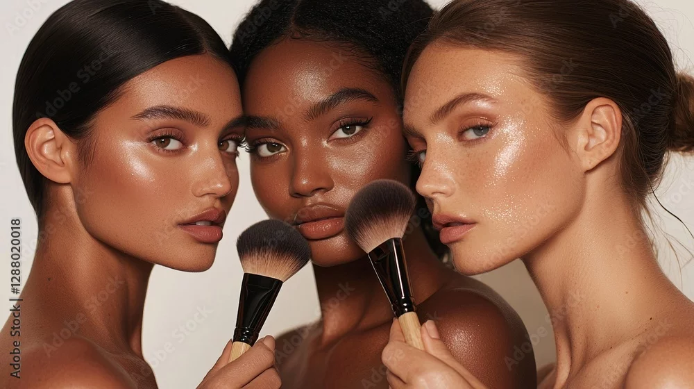 Obraz The application of Contour and Highlight makeup is shown on a young woman, as a multiracial lady uses a brush to apply her makeup and undergo a professional face contouring session