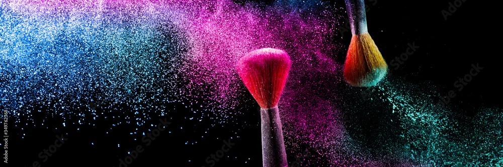 Obraz Two brushes with pink and blue make up powder impact to make a colorful cloud. - do gabinetu kosmetycznego - Picturewall.pl