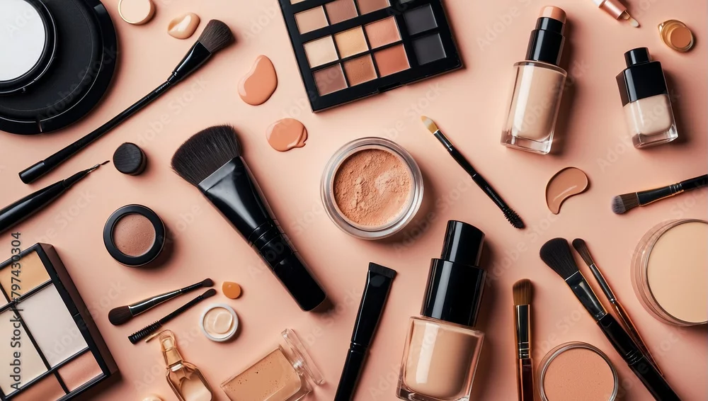 Obraz Various makeup products are arranged on a peach-tone background. There are eyeshadow palettes, blush, foundation, brushes, and other makeup items.