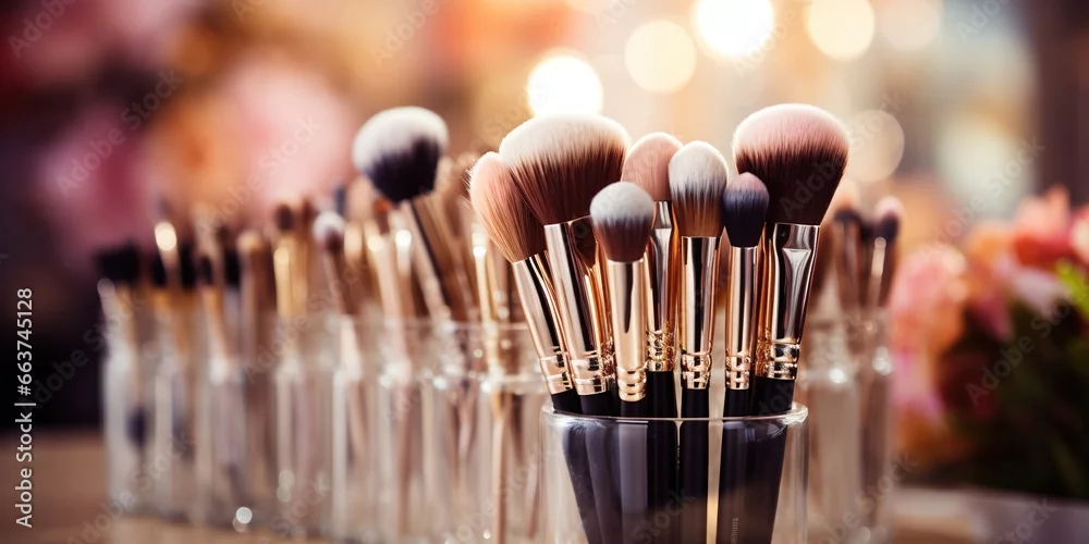 Obraz Various professional make - up brushes of a makeup artist in a transparent glass on a light blurred background.