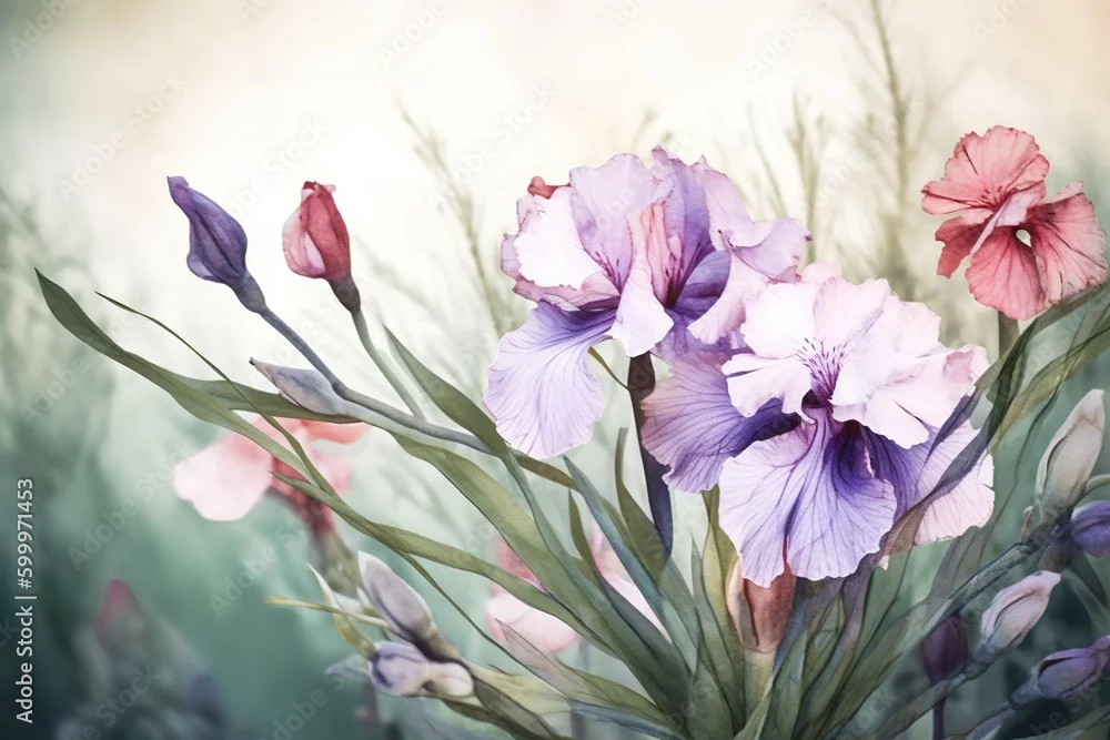Obraz tło kwiatowe, irysy, akwarela - wygenerowane przez AI