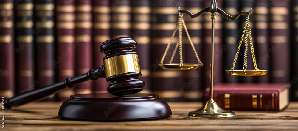A judge's gavel and brass scales of justice sit on a wooden surface with law books in the background, symbolizing law, fairness, and judicial authority.