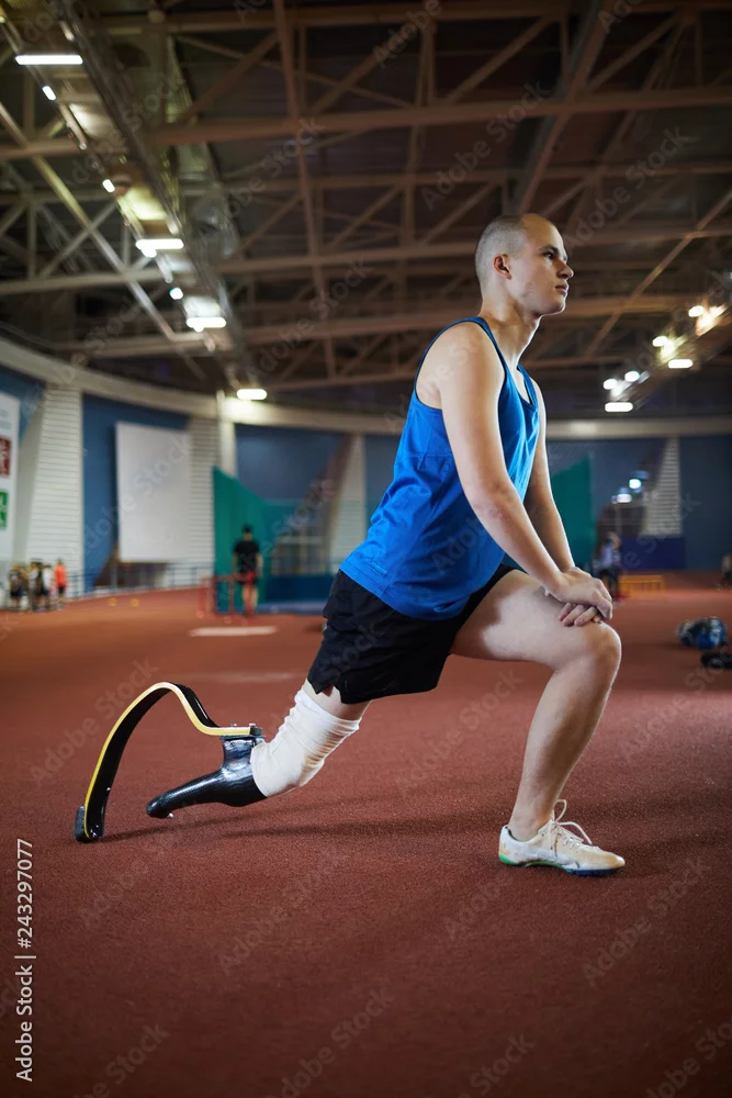 Obraz Active sportsman with prosthesis in right leg doing stretching exercise at stadium before paralympic competition