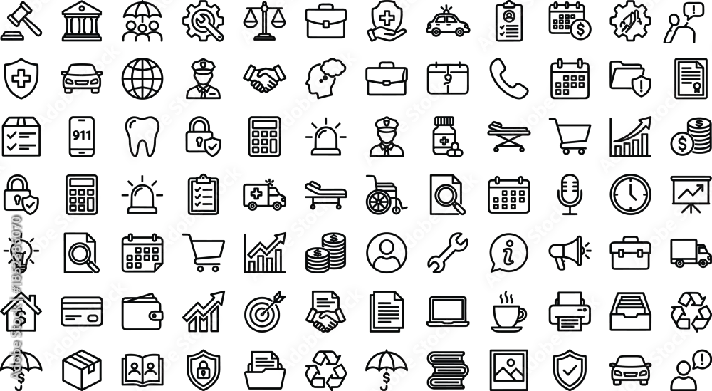 Business insurance and finance line icons set, healthcare law security technology marketing logistics banking vector outline symbols collection for web app ui design usage