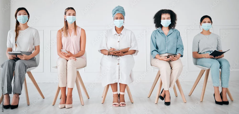 Compliance, recruitment and covid laws with business women waiting for an interview at corporate office. Hiring, corona and social distance with diverse group practice safety at company together