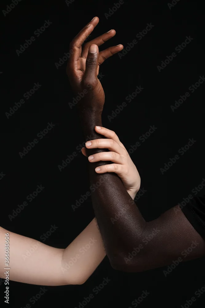 Obraz Hands of Caucasian woman and African-American man on dark background. Racism concept