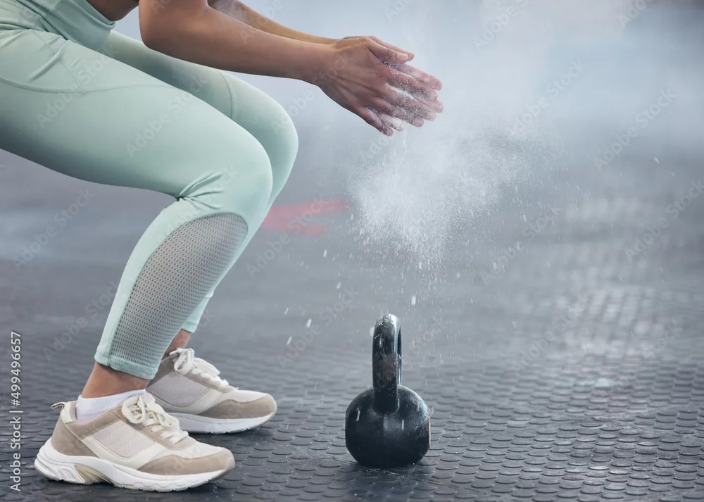 Hard muscles coming right up. Shot of an unrecognisable woman dusting her hands with chalk powder before working out with kettle bell weights in a gym.