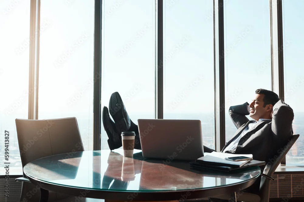 Obraz Hard work truly does pay off. a young businessman relaxing with his feet up on a table in an office. - do kancelarii prawnej - Picturewall.pl