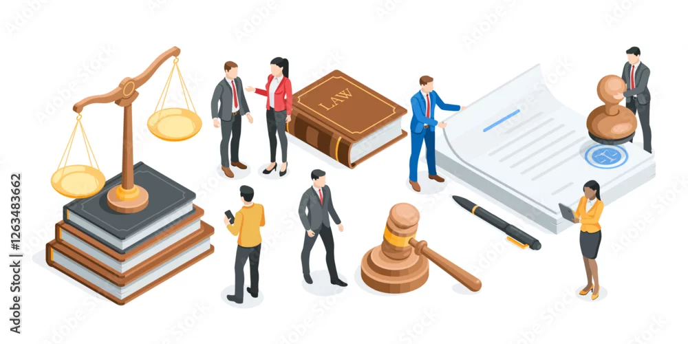 isometric vector concept on the theme of court and law, in color on a white background, scales and a judge's gavel with book and documents and business people