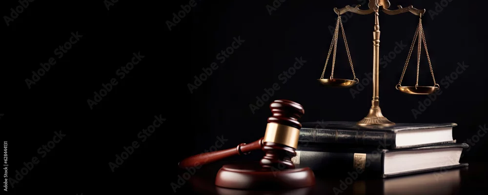 Obraz Judge gavel, law scales and books on black background. Law concept of Judiciary, Jurisprudence and Justice. Copy space