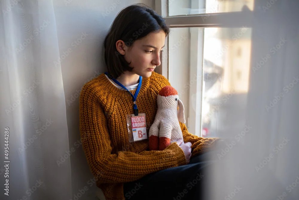 Obraz Sad Ukrainian refugee schoolgirl missing home and looking through window. Ukrainian war concept. - do kancelarii prawnej - Picturewall.pl