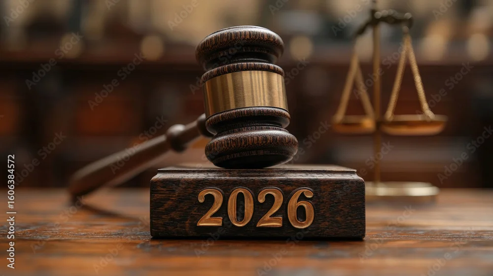 Wooden judge gavel with engraved 2026 on wooden stand as symbol of justice, law and legal system, representing court decisions, legal trends and justice concepts for New Year 2026 banner