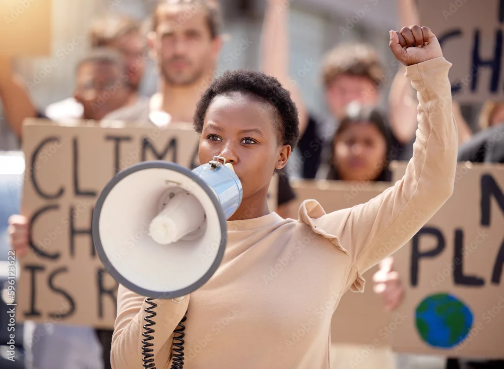 Obraz You will hear our voices. a young woman speaking through a megaphone at a protest. - do kancelarii prawnej - Picturewall.pl