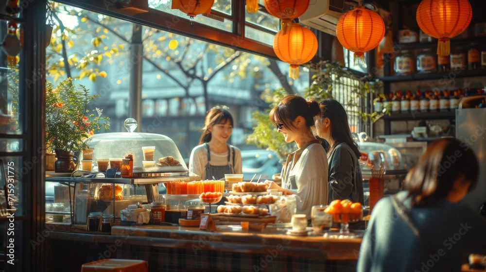 Obraz A casual lifestyle scene of friends sharing a variety of Eastern sweets at a cozy cafe decorated with hanging lanterns. Concept of socializing, cafe culture, casual dining, and friendly atmosphere.