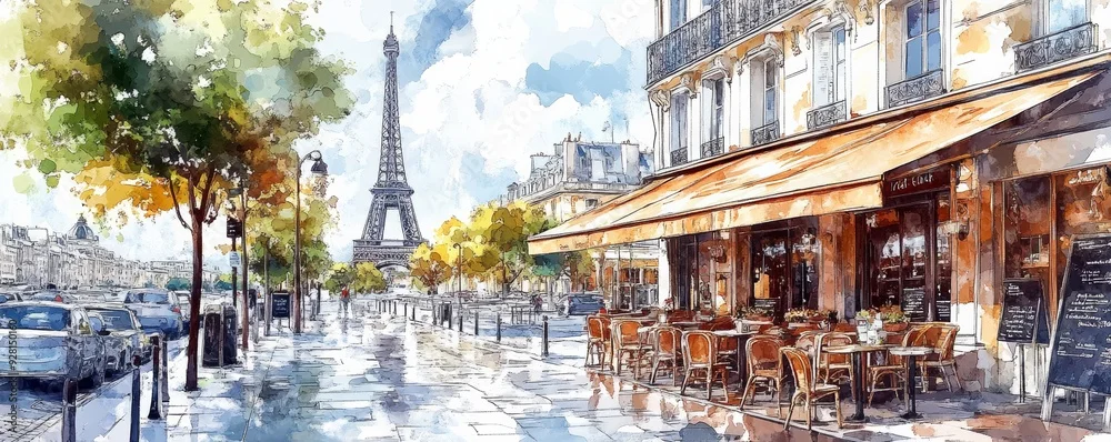 Obraz A picturesque Paris street scene featuring the Eiffel Tower, charming cafes, and vibrant greenery, evoking romance and beauty.