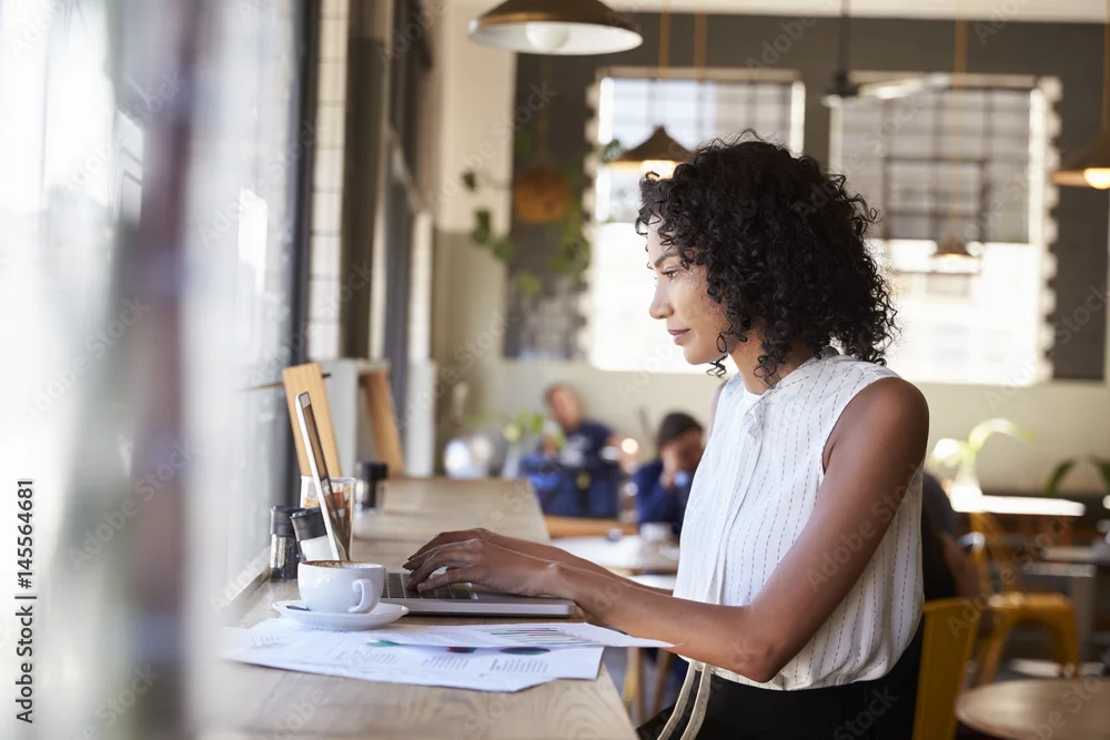 Obraz Businesswoman By Window Working On Laptop In Coffee Shop