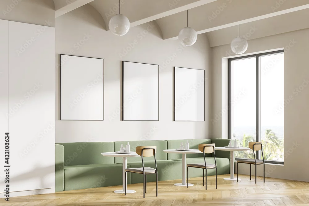 Cafeteria, dining room in university, cafe with tables and chairs, counter bar hotel. Canteen interior in school, college or office. Mock up posters copy space.